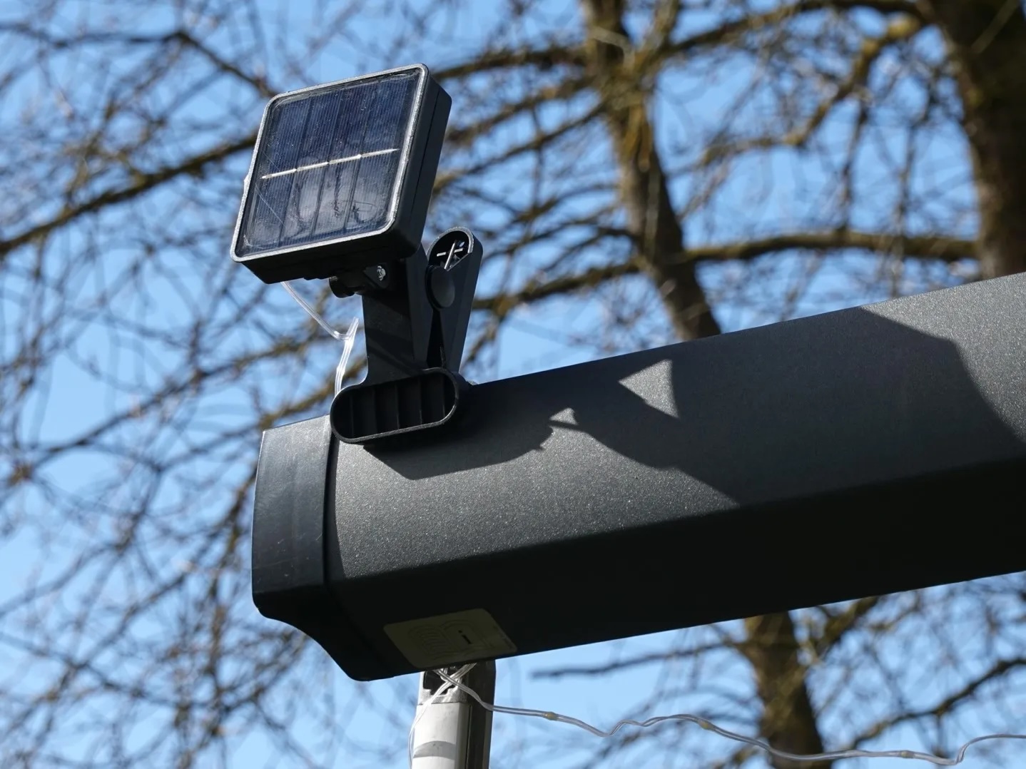Extra großes Solarpanel für über 12h Leuchtdauer, das mit einem Klipp direkt an der Markise befestigt wird