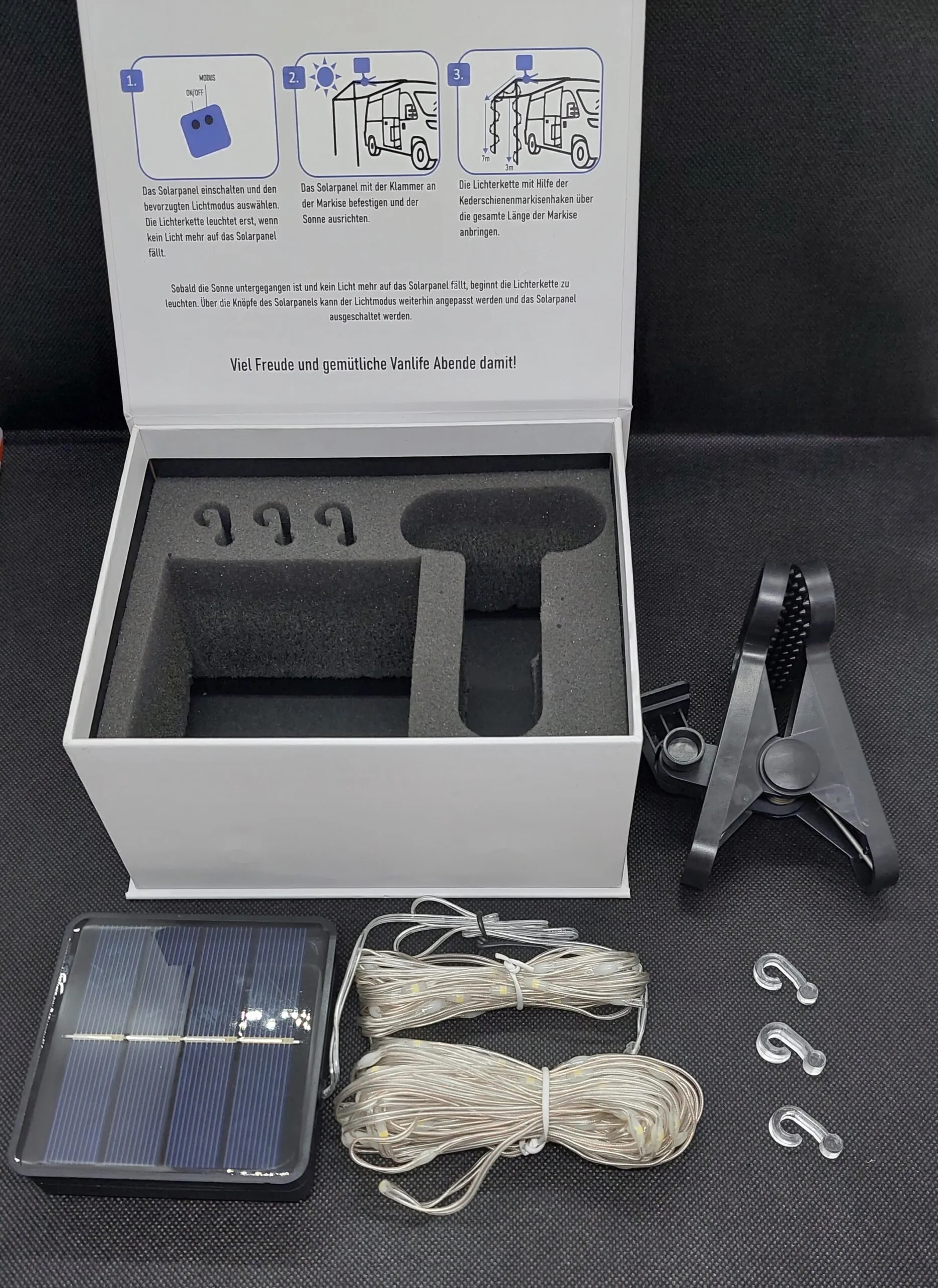 Die Camperflower Solar Markisen Lichterkette wird in einer praktischen Transportbox mit Anleitung geliefert. Sie enthält die folgenden Komponenten: