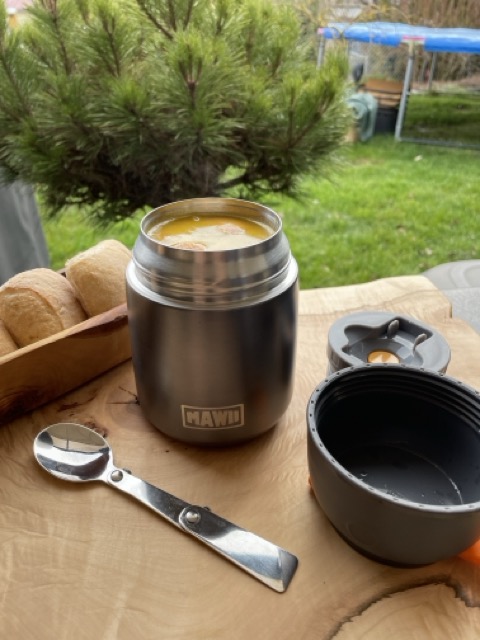 Unser Thermobehälter to go ist perfekt für Outdoor um warum Speisen und heiße Suppen bis 8 Stunden warm zu halten. Dank seiner extra großen Öffnung kann man auch Obst, Gemüse, Joghurt oder kalte Getränke bis zu ca. 14 Stunden kühlen.Der praktischen Edelstahl-Faltlöffel ist selbstverständlich mit dabei.Der Thermobehälter besteht aus strapazierfähigen Stainless Steel mit doppelwandiger Vakuumisolierung. Auslaufsicher dank doppeltem Verschluss.Hergestellt aus 18/8 Edelstahl, rostfrei und Spülmaschinen geeignet. Die Farbe ist bruchfest und blättert nicht ab und bekommt keine Risse und ist 100 % Auslaufsicher!Fassungsvermögen: 520 mlFarbe: Edelstahl schwarz