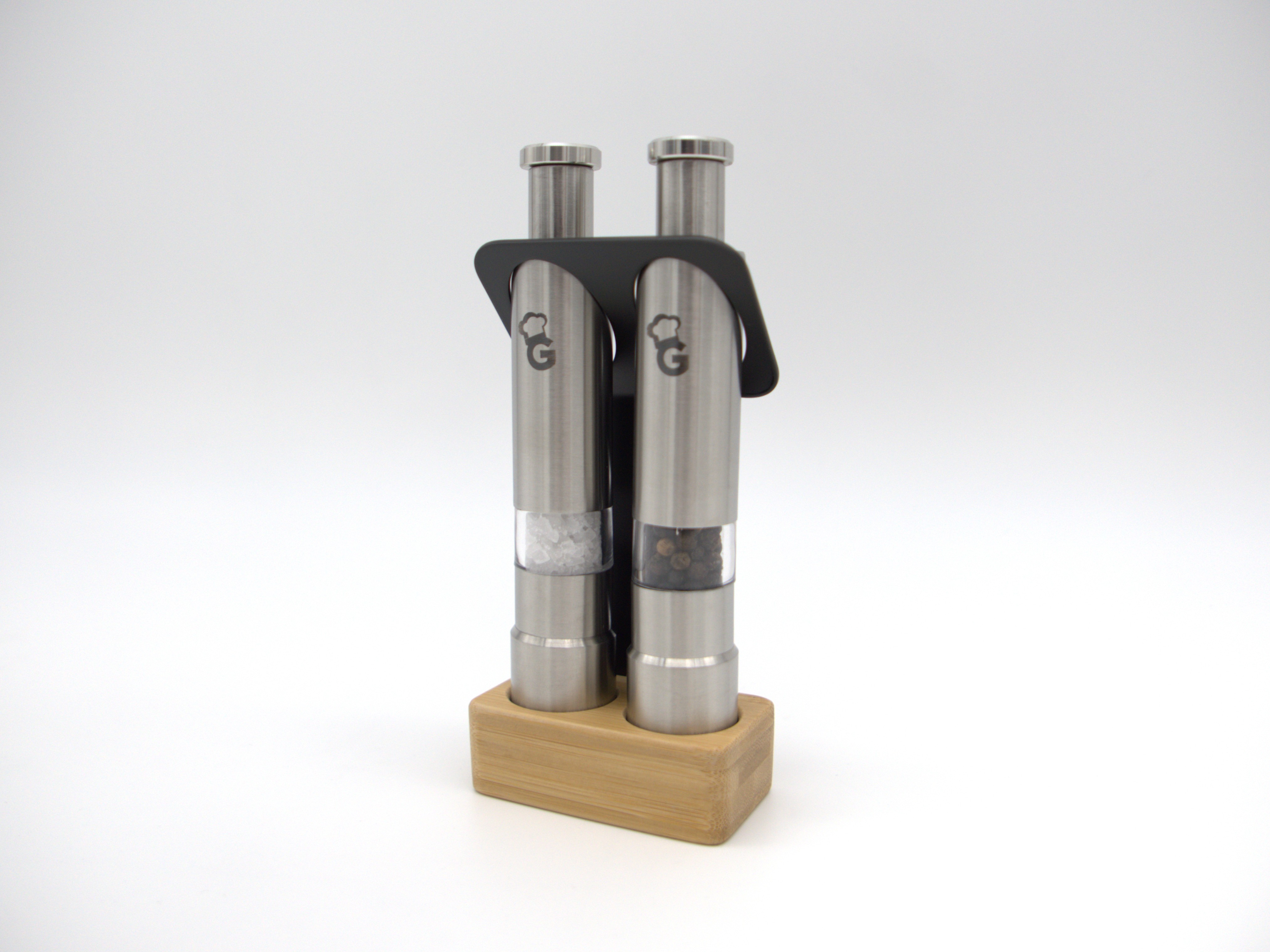 Zwei Mühlen im eleganten Halter aus schwarz pulverbeschichtetem Edelstahl mit Bambuseinsatz sowie zwei Magneten mit Befestigungsplatte. Sicher verstaut und trotzdem überall da, wo du sie brauchst. Durch die Magneten kannst du die Gewürzmühlen ganz einfach an jeder magnetischen Fläche befestigen, sogar an deinem Kastenwagen.
