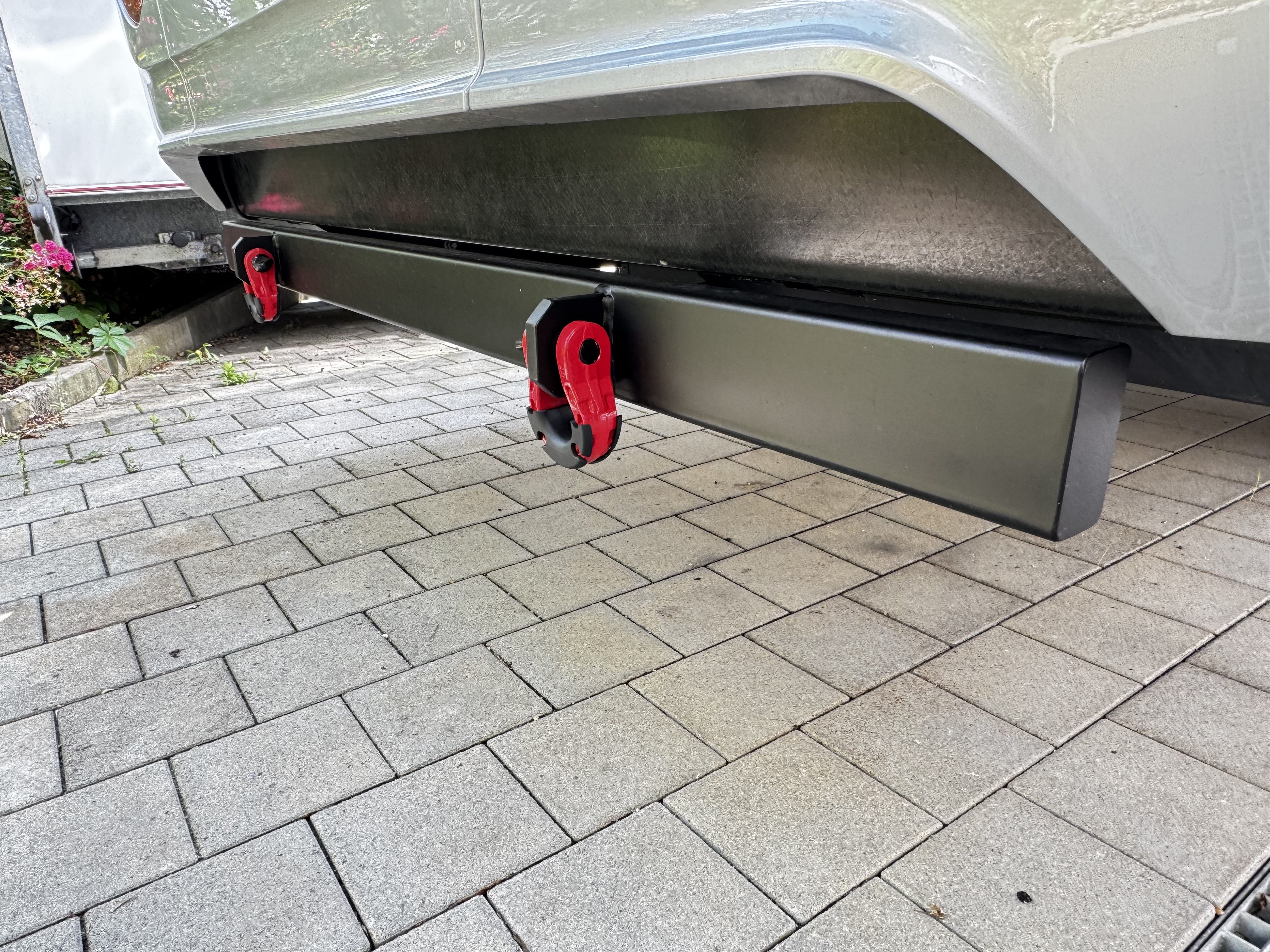 Länge ca 174,50 cm, Tiefe ca 5 cm. Breite ca 9 cm, Farbe schwarz lackiert, aus Stahl gefertigt, gefertigt in Deutschland! Wird an die Rahmenverlängerung montiert, ink. 6 Schrauben und Muttern! Es darf keine Anhängerkupplung angebaut sein!