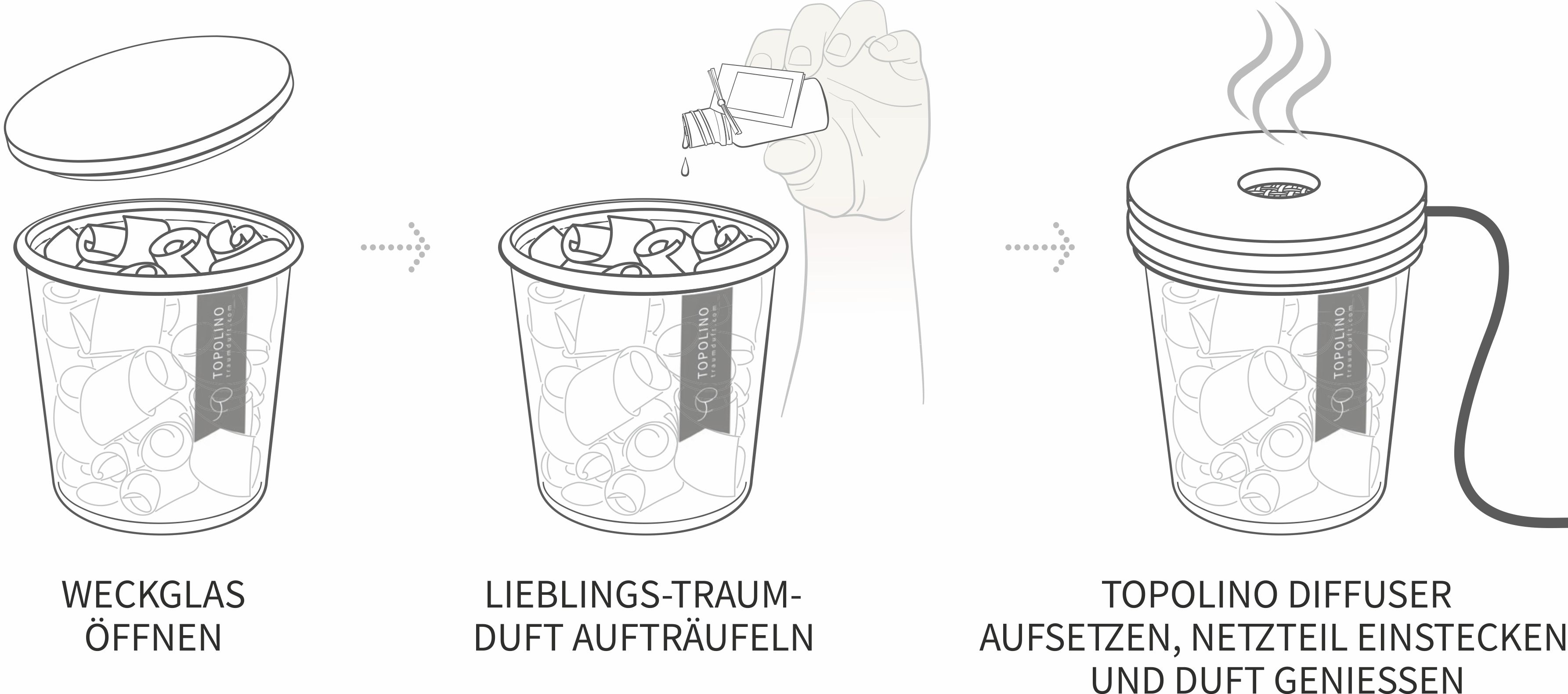 für die optimale Duftverteilung. Entscheiden Sie selbst, welchen Ihrer Lieblings-Traumdüfte Sie gern wie intensiv haben möchten. Weckglas gefüllt mit Trucciolo Buchenspan in Kombination mit dem sehr leisen Lüfter-Element schaffen ein wundervolles Dufterlebnis-das völlig wartungsfrei. Einfach auf das Weckglas das Lüftungselement drauf setzen und das Netzteil in die Steckdose stecken. Der Duft entfaltet sich anschließend sanft im Raum. Diese clevere Raumauflösung vereint viele Aspekte unserer Traumduft-Philosophie der Nachhaltigkeit.